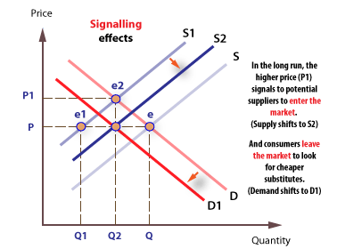 Price changes send contrasting messages to consumers and producers about whether to enter or leave a market. Rising prices give a signal to consumers to reduce demand or withdraw from a market completely, and they give a signal to potential producers to enter a market. Conversely, falling prices give a positive message to consumers to enter a market while sending a negative signal to producers to leave a market. For example, a rise in the market price of ‘smart’ phones sends a signal to potential manufacturers to enter this market, and perhaps leave another one. In terms of the labour market a rise in the wage rate, which is the price of labour, provides a signal to the unemployed to join the labour market. The signalling function is associated with shift in demand and supply curve.