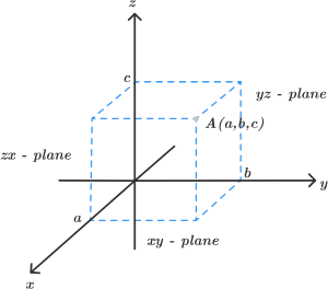 Let there be a point P in space as shown in the figure below. If we drop a perpendicular PB on the XY plane and then from point B, we drop perpendiculars BA and BC on the x-axis and y-axis respectively. Assuming the length of the perpendiculars BC, BA and PB as x, y and z respectively. These lengths x, y and z are known as the co-ordinates of the point P in three-dimensional space. It must be noted that while giving the coordinates of a point, we always write them in order such that the co-ordinate of x-axis comes first, followed by the co-ordinate of the y-axis and the z-axis. Thus for each point in space there exist an ordered 3-tuple of real numbers for its representation.